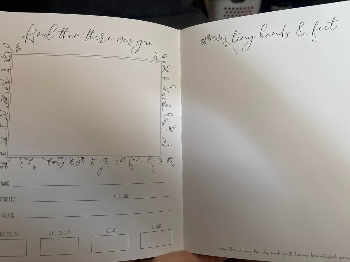 This book is simply printed with black ink on clean, white pages. Each page is designed with hand-sketched modern leaves. Every baby should have his/her own book! Differentiate by personalizing the cover with your baby's photo and his/her footprint or handprint.